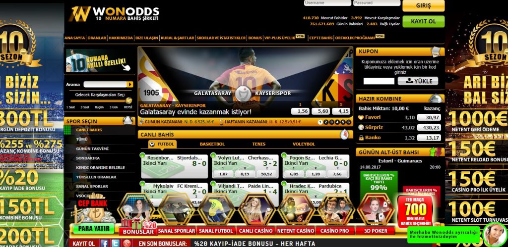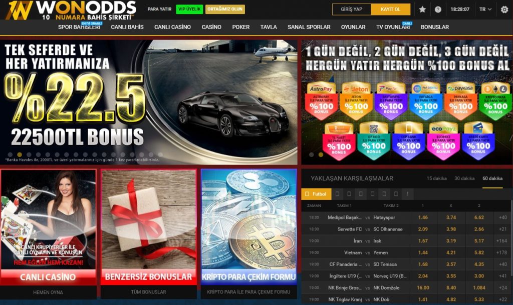 Wonodds size en yüksek oranlarla bahis alma fırsatı ve kullanıcı odaklı hizmet kalitesi ile sunar. Wonodds spor oyunları 20’den fazla spor dalı, 7000’den fazla bahis seçeneği ve 50.000’den fazla karşılaşma ile sizlere sürekli heyecan sunuyor. En iyi, hızlı oranlar ve her an canlı karşılaşmalar ile kazanma kapılarını aralıyor. Wonodds casinosunda 1000’den fazla slot oyunları ile şansınızı çevirirken, canlı casinoda canlı kurpiyeler ile blackjack, rulet, sicbo, dragon&tiger ve bacarat ile sürekli kazanabilirsiniz. Site üzerinde sunulan verilerin her zaman güncel ve doğru olmasına özen gösteriyor olsa da veriler sadece bilgi amaçlıdır ve kesinlik kaydetmemektedir. Maç sonuçları,maç zamanı gibi veriler doğru olmaması durumunda kuruluşumuz konu ile ilgili sorumluluk kabul etmemektedir. Lütfen kural ve şartlar kısmında bulunan bahis ve sonuçlandırma bölümünü dikkate alınız.